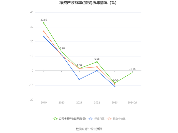 数据显示,2024年第一季度公司加权平均净资产收益率为-1.18%,较上年同期增长0.37个百分点;公司2024年第一季度投入资本回报率为-0.39%,较上年同期增长0.27个百分点。