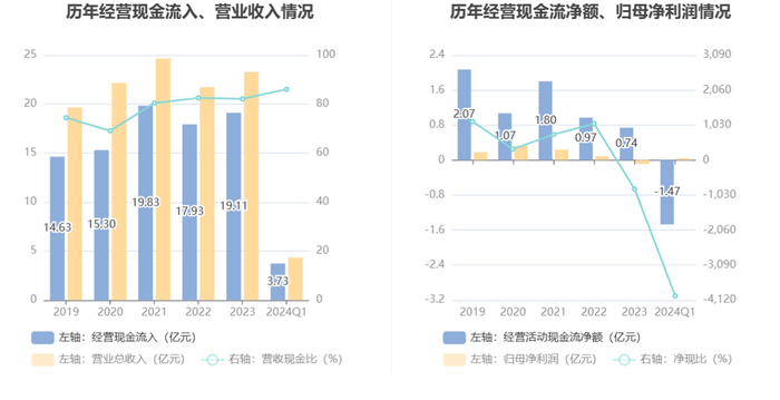 2024年第一季度,公司营业收入现金比为86.04%,净现比为-3998.74%。