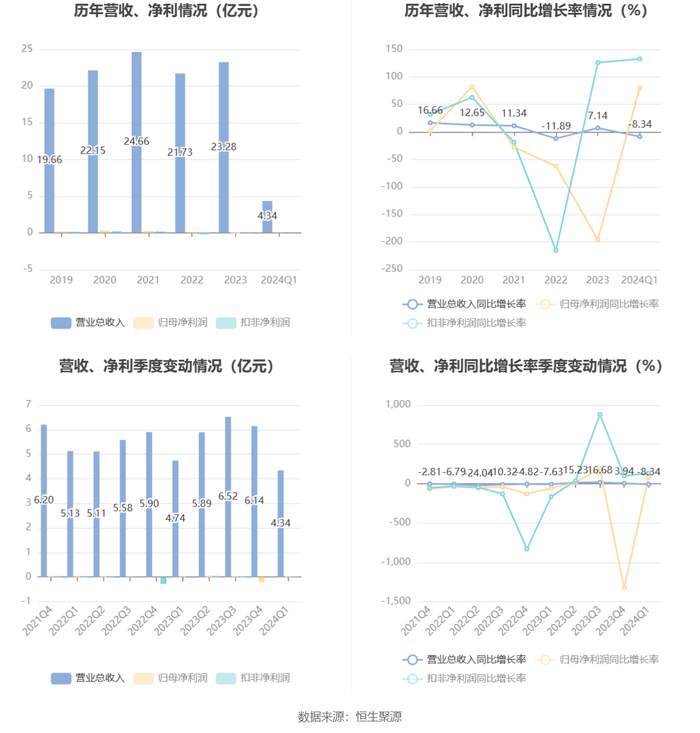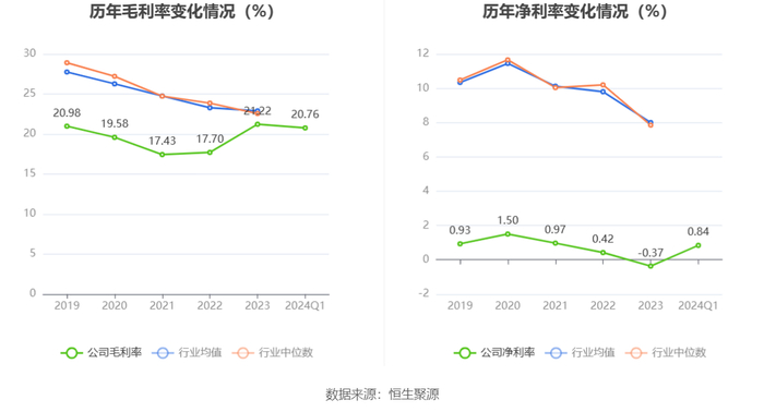 2024年第一季度,公司毛利率为20.76%,同比上升2.29个百分点;净利率为0.84%,较上年同期上升0.41个百分点。