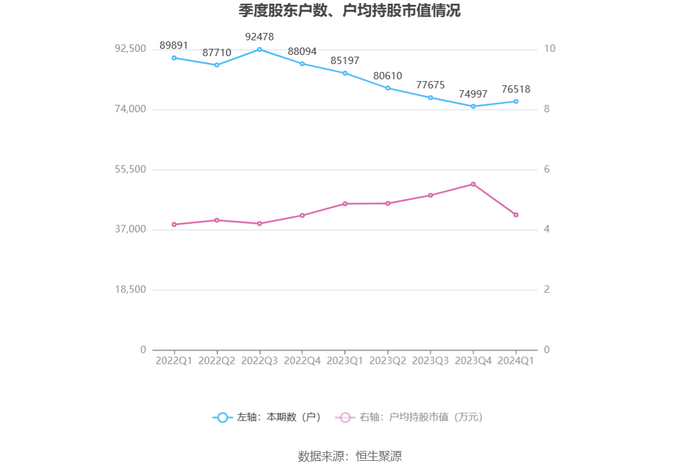 筹码集中度方面,截至2024年一季度末,公司股东总户数为7.65万户,较上年末增长了1521户,增幅2.03%;户均持股市值由上年末的5.52万元下降至4.50万元,降幅为18.48%。