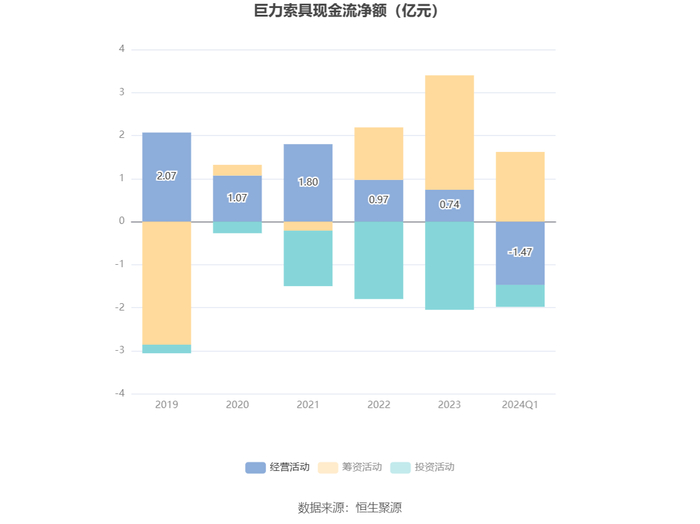 2024年第一季度,公司经营活动现金流净额为-1.47亿元,同比减少157.12万元;筹资活动现金流净额1.62亿元,同比减少9209.74万元;投资活动现金流净额-5141.40万元,上年同期为-7577.84万元。