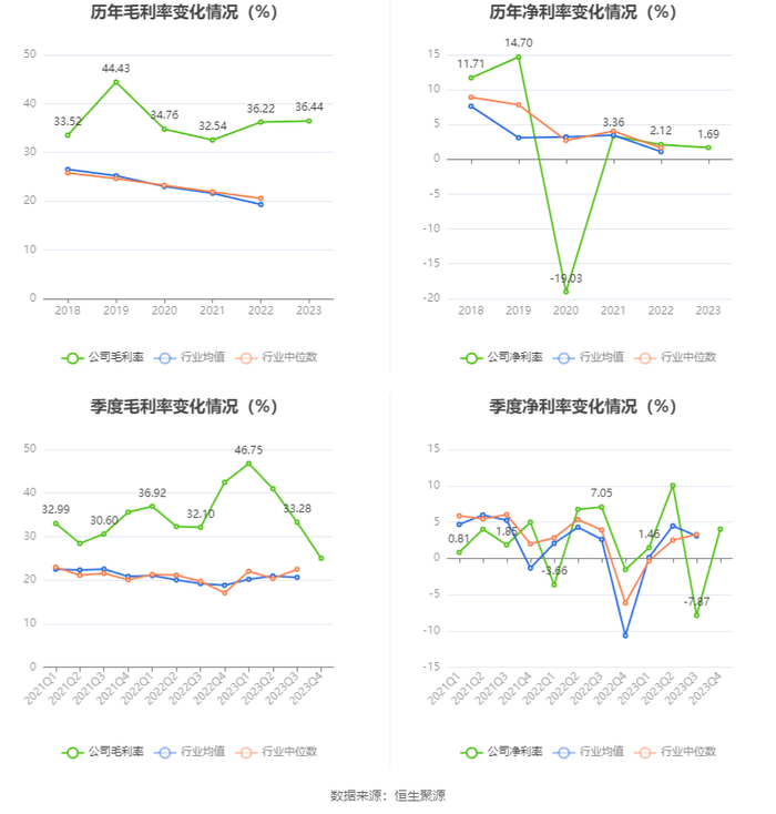 2023年,公司毛利率为36.44%,同比上升0.22个百分点;净利率为1.69%,较上年同期下降0.43个百分点。从单季度指标来看,2023年第四季度公司毛利率为24.99%,同比下降17.45个百分点,环比下降8.29个百分点;净利率为4.02%,较上年同期上升5.58个百分点,较上一季度上升11.89个百分点。
