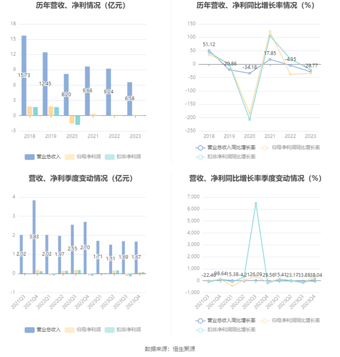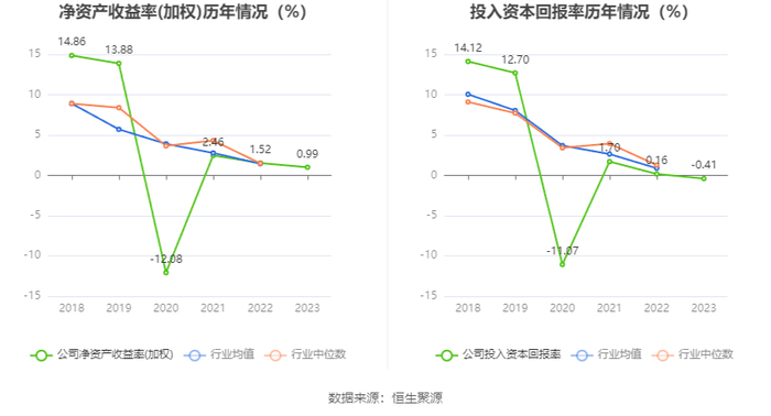 数据显示,2023年公司加权平均净资产收益率为0.99%,较上年同期下降0.53个百分点;公司2023年投入资本回报率为-0.41%,较上年同期下降0.57个百分点。