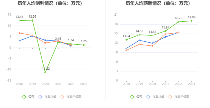 截至2023年末,公司员工总数为1100人,人均创收59.82万元,人均创利1.25万元,人均薪酬19.08万元,较上年同期分别变化-21.84%、-28.01%、1.59%。