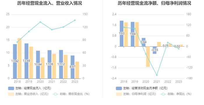 2023年,公司营业收入现金比为136.36%,净现比为-12.72%。