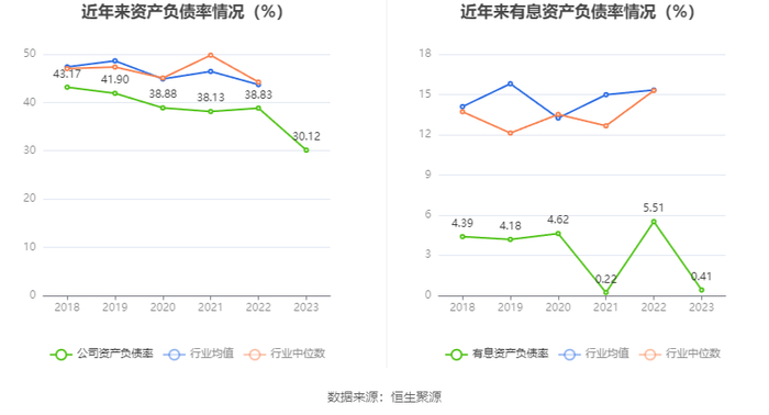 在偿债能力方面,公司2023年年末资产负债率为30.12%,相比上年末下降8.71个百分点;有息资产负债率为0.41%,相比上年末下降5.10个百分点。