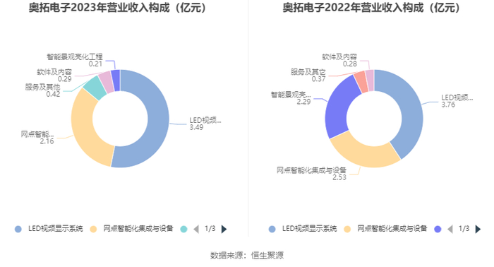 分产品来看,2023年公司主营业务中,LED视频显示系统收入3.49亿元,同比下降7.15%,占营业收入的53.07%;网点智能化集成与设备收入2.16亿元,同比下降14.64%,占营业收入的32.85%;软件及内容收入0.29亿元,同比增长2.13%,占营业收入的4.39%。