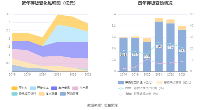 从存货变动来看,截至2023年年末,公司存货账面价值为2.93亿元,占净资产的20.95%,较上年末减少4418.16万元。其中,存货跌价准备为2779.89万元,计提比例为8.66%。