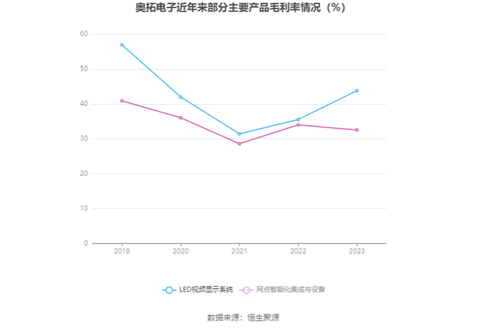 分产品看,LED视频显示系统、网点智能化集成与设备、软件及内容2023年毛利率分别为43.84%、32.54%、32.79%。