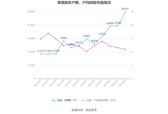 筹码集中度方面,截至2023年年末,公司股东总户数为8.48万户,较三季度末增长了1.77万户,增幅26.46%;户均持股市值由三季度末的6.97万元下降至6.59万元,降幅为5.45%。
