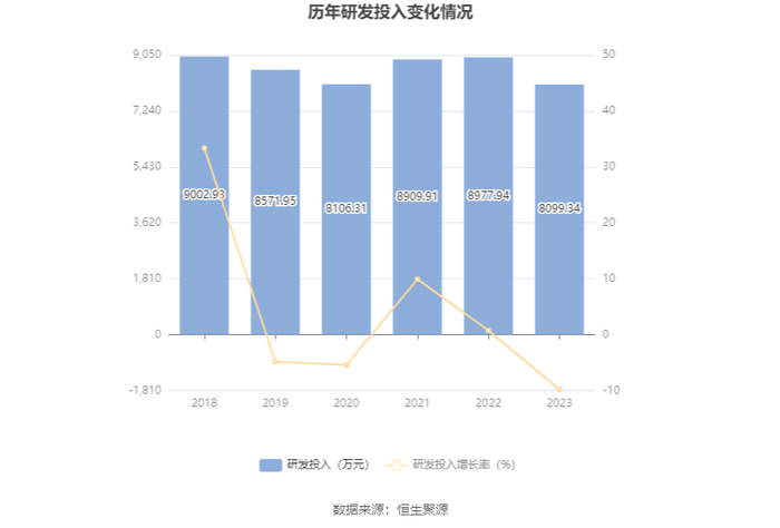 2023年全年,公司研发投入金额为8099.34万元,同比下降9.79%;研发投入占营业收入比例为12.31%,相比上年同期上升2.59个百分点。此外,公司全年研发投入资本化率为0。