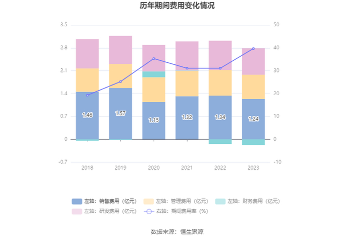 2023年,公司期间费用为2.61亿元,较上年同期减少2590.43万元;但期间费用率为39.73%,较上年同期上升8.63个百分点。其中,销售费用同比下降8.03%,管理费用同比下降4.76%,研发费用同比下降9.79%,财务费用由去年同期的-1449.47万元变为-1712.59万元。