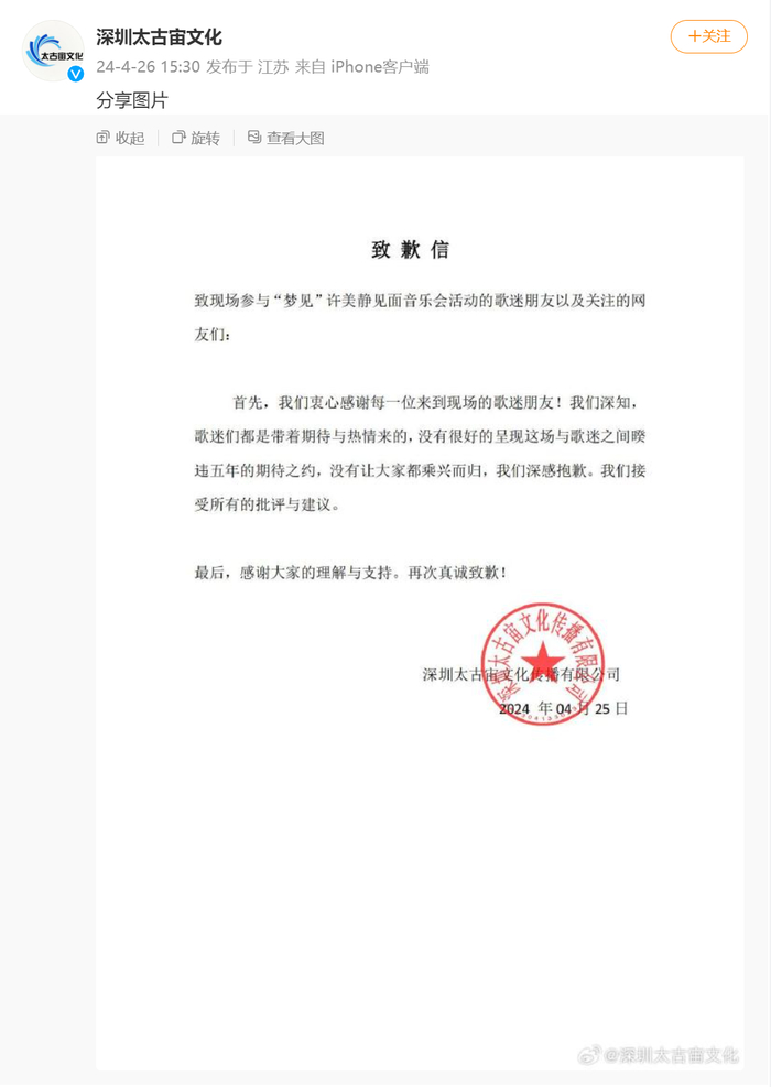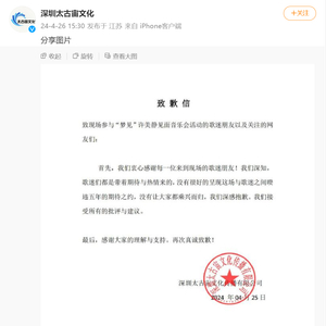 4月26日,就许美静见面音乐会相关争议,主办方@深圳太古宙文化 发布致歉信。