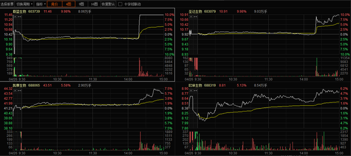相关个股应声而动,今日2点后,蔚蓝生物直线涨停,圣达生物冲击涨停,欧林生物、凯赛生物、播恩集团等跟涨。