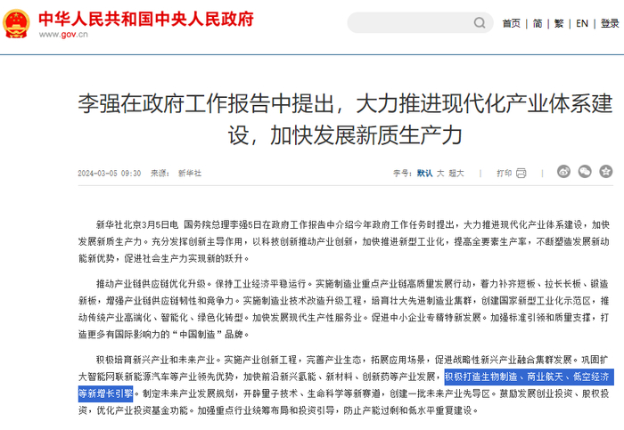 基于此,生物制造被视作新质生产力非常重要的新赛道和新业态。我国2024年政府工作报告提出,“积极打造生物制造、商业航天、低空经济等新增长引擎”。生物制造与生命科学、低空经济等一起,为政府工作报告首次提到的行业。