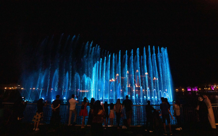 2020年10月24日晚,在阿拉伯联合酋长国迪拜棕榈岛,当地居民和游客欣赏音乐喷泉表演。新华社发