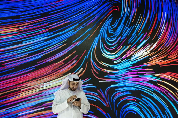 2019年10月6日,在阿联酋迪拜,一名参观者在2019迪拜GITEX消费电子展上使用手机。新华社发(马哈茂德·哈立德摄)