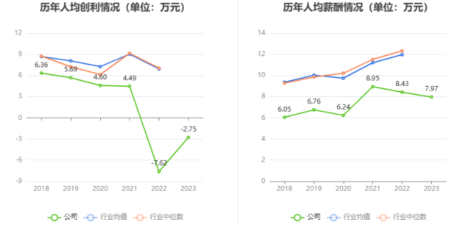 截至2023年末,公司员工总数为952人,人均创收70.69万元,人均创利-2.75万元,人均薪酬7.97万元,较上年同期分别变化19.08%、63.92%、-5.51%。