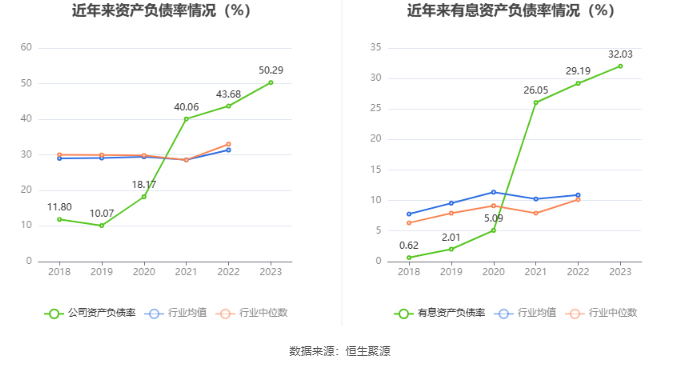 在偿债能力方面,公司2023年年末资产负债率为50.29%,相比上年末上升6.61个百分点;有息资产负债率为32.03%,相比上年末上升2.84个百分点。