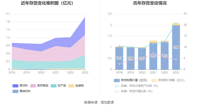 从存货变动来看,截至2023年年末,公司存货账面价值为1.99亿元,占净资产的21.0%,较上年末增加7657.95万元。其中,存货跌价准备为947.31万元,计提比例为4.54%。
