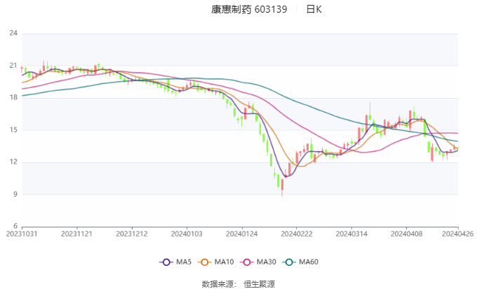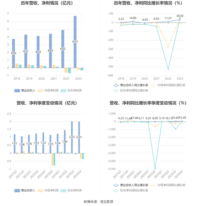 中证智能财讯 康惠制药(603139)4月27日披露2023年年报。2023年,公司实现营业总收入6.73亿元,同比增长36.92%;归母净利润亏损2615.86万元,上年同期亏损6305.59万元;扣非净利润亏损3265.76万元,上年同期亏损6651.71万元;经营活动产生的现金流量净额为-7213.43万元,上年同期为5043.42万元;报告期内,康惠制药基本每股收益为-0.26元,加权平均净资产收益率为-2.72%。
