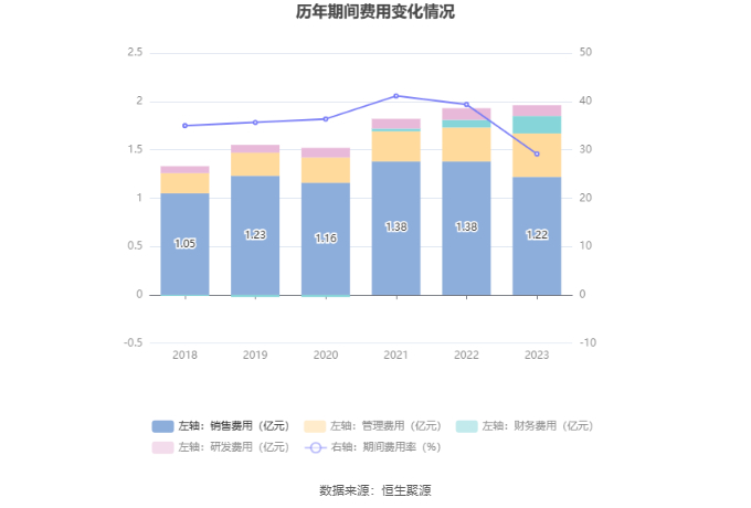 2023年,公司期间费用为1.96亿元,较上年同期增加268.84万元;但期间费用率为29.15%,较上年同期下降10.22个百分点。其中,销售费用同比下降11.94%,管理费用同比增长28.74%,研发费用同比下降11.06%,财务费用同比增长133.38%。