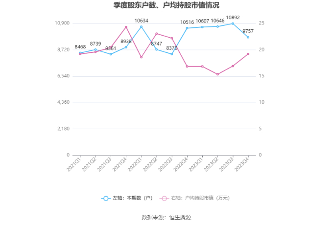 筹码集中度方面,截至2023年年末,公司股东总户数为9757户,较三季度末下降了1135户,降幅10.42%;户均持股市值由三季度末的16.94万元上升至19.21万元,增幅为13.40%。