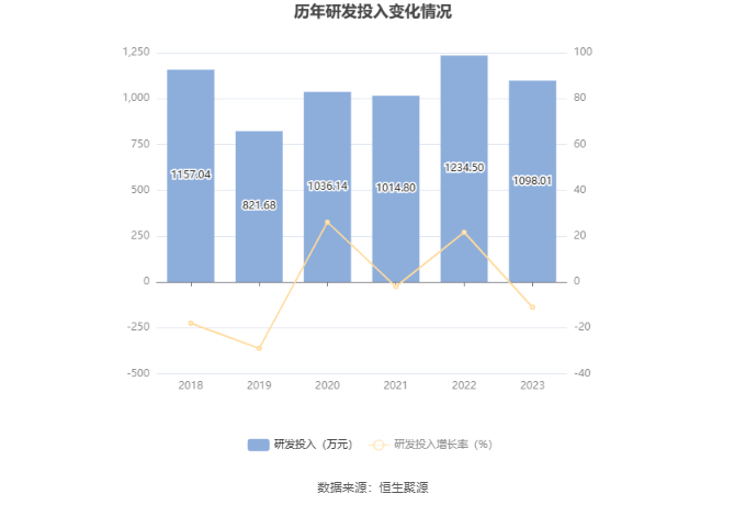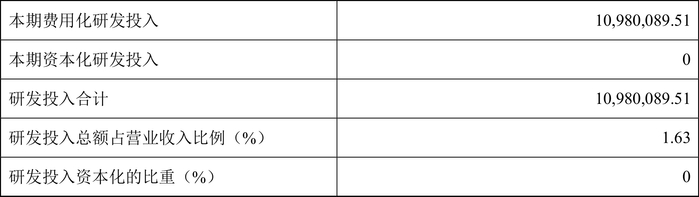 2023年全年,公司研发投入金额为1098.01万元,同比下降11.06%;研发投入占营业收入比例为1.63%,相比上年同期下降0.88个百分点。此外,公司全年研发投入资本化率为0。