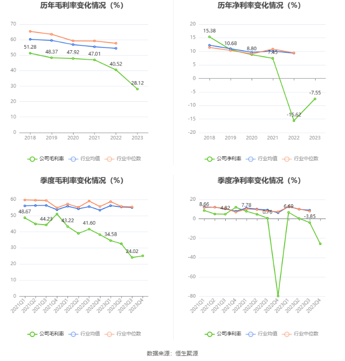 2023年,公司毛利率为28.12%,同比下降12.40个百分点;净利率为-7.55%,较上年同期上升8.07个百分点。从单季度指标来看,2023年第四季度公司毛利率为25.05%,同比下降13.17个百分点,环比上升1.03个百分点;净利率为-25.85%,较上年同期上升54.00个百分点,较上一季度下降22.00个百分点。