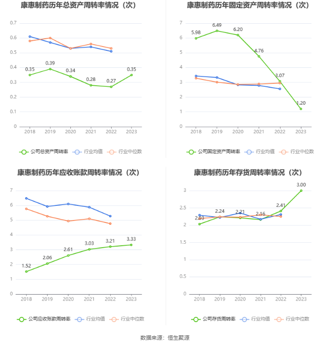 营运能力方面,2023年,公司公司总资产周转率为0.35次,上年同期为0.27次(2022年行业平均值为0.51次,公司位居同行业65/74);固定资产周转率为1.20次,上年同期为3.07次(2022年行业平均值为2.56次,公司位居同行业33/74);公司应收账款周转率、存货周转率分别为3.33次、3.00次。