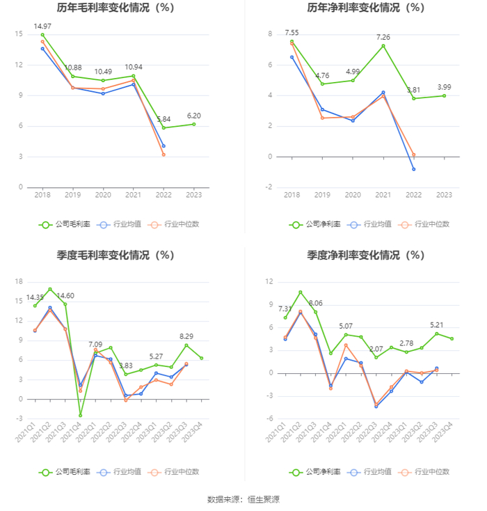 2023年,公司毛利率为6.20%,同比上升0.36个百分点;净利率为3.99%,较上年同期上升0.18个百分点。从单季度指标来看,2023年第四季度公司毛利率为6.32%,同比上升1.83个百分点,环比下降1.97个百分点;净利率为4.55%,较上年同期上升1.15个百分点,较上一季度下降0.66个百分点。