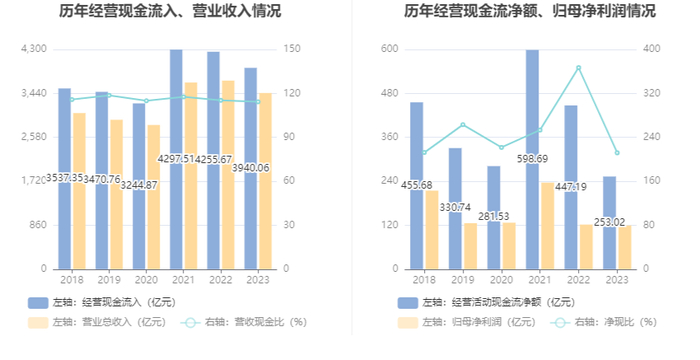2023年,公司经营活动现金流净额为253.02亿元,同比下降43.42%;筹资活动现金流净额-56.81亿元,同比增加80.58亿元;投资活动现金流净额-158.06亿元,上年同期为-261.91亿元。