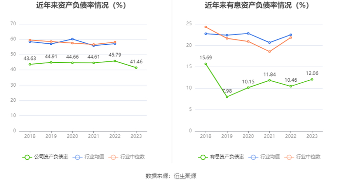 在偿债能力方面,公司2023年年末资产负债率为41.46%,相比上年末下降4.33个百分点;有息资产负债率为12.06%,相比上年末上升1.60个百分点。