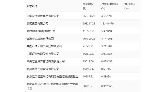 年报显示,2023年年末公司十大流通股东中,持股最多的为中国宝武钢铁集团有限公司,占比43.53%。十大流通股东名单相比2023年三季报维持不变。在具体持股比例上,中国宝武钢铁集团有限公司、武钢集团有限公司、太原钢铁(集团)有限公司、中国石油天然气集团有限公司、中国证券金融股份有限公司、中央汇金资产管理有限责任公司、北京首熙投资管理有限公司、东方红启恒三年持有期混合型证券投资基金、大成基金-农业银行-大成中证金融资产管理计划持股有所上升,香港中央结算有限公司持股有所下降。
