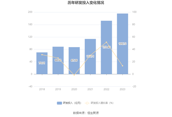 2023年全年,公司研发投入金额为195.73亿元,同比增长13.49%;研发投入占营业收入比例为5.68%,相比上年同期上升0.99个百分点。此外,公司全年研发投入资本化率为82.53%。