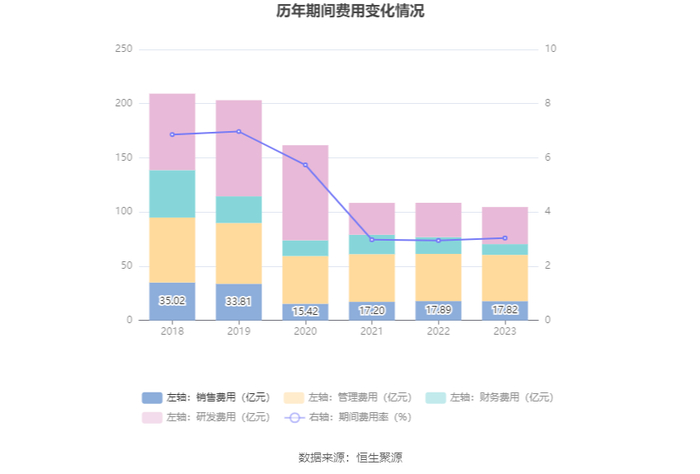 2023年,公司期间费用为104.61亿元,较上年同期减少3.93亿元;但期间费用率为3.04%,较上年同期上升0.09个百分点。其中,销售费用同比下降0.41%,管理费用同比下降1.93%,研发费用同比增长7.91%,财务费用同比下降35.73%。