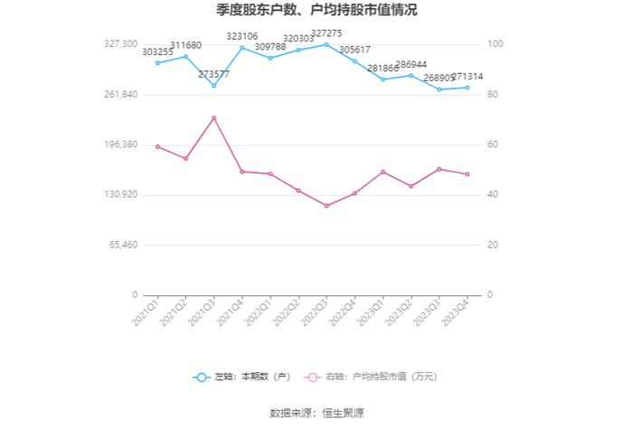 筹码集中度方面,截至2023年年末,公司股东总户数为27.13万户,较三季度末增长了2409户,增幅0.90%;户均持股市值由三季度末的50.42万元下降至48.35万元,降幅为4.11%。