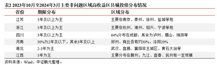 根据高收益区县城投债分布、区域基本面等维度,我们将区县城投债的投资区域分为问题区域和非问题区域。在非问题区域,我们建议重点关注区县上级政府的财政实力、自身经济财政潜力,选择省会城市、经济财政在省内排序靠前地级市的区县,并优先考虑具备产业和资源禀赋优势、区域债务管控有序、债务结构合理(包括融资渠道和债务期限)的区域。“35号文”后主要非问题区域包括江浙、四川、河南、湖北、江西等地,上述省份中不排除个别区域也存在一定非标逾期问题。其中江浙两地高收益区县城投债发行规模大,主要分布在财力相对偏弱、区县平台较多且管控无序的区域,虽然江浙两地经济财政实力强、发生信用风险概率较小,但拥有多个平台的区县,政府财政支持分流严重,在紧周期中或许“顾此失彼”,建议优先选择区域内的核心平台。其余经济财政实力中上、债务舆情风险可控的省份中,省会及省内经济重要性较高、主导产业发展潜力较大地级市的区县投资机会值得关注,但局部发生非标舆情、债务结构较差、偿债压力较大的尾部区县,需谨慎参与。