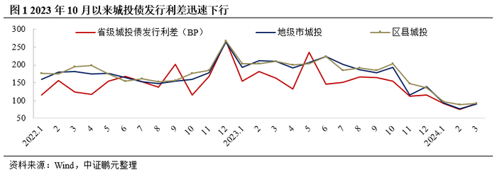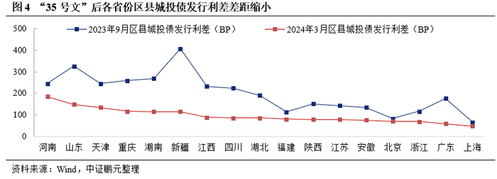 化债政策驱动下,城投债刚兑预期显著加强,发行利差迅速收敛。“35号文”后市场普遍预计2025年之前城投债出现逾期的概率很低,叠加发债监管收紧导致城投债供给减少,城投债“资产荒”加剧,新发城投债出现“抢券”行情,带动城投债发行利差迅速下行。化债背景下,城投债供给恢复增长的概率较低,债券市场资产荒预计持续,城投债利差可能继续维持在较低水平。