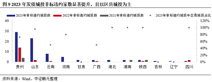 在问题区域,除关注区域信用风险外,还应考虑到期时非违约情形下的自由退出阻力等因素。在“35号文”后,区县城投债发行利差对估值波动的保障程度较低,投资者面临的估值波动风险加大;此外,虽然城投债借新还旧得到政策保障,但能否成功续发新债受到市场认可度等因素影响而存在不确定性,债务压力较大、负面舆情频发区域的区县城投债投资者在债券到期后的退出可能面临阻力。在问题区域,我们建议在关注区县上级政府的财政实力、自身经济财政潜力的基础上,重点关注经济、政治重要性较高,一揽子化债政策落地以来取得较多支持,债务状况持续优化的区域。值得注意的是,部分省份高收益区县城投债基本分布于存在非标违约舆情区域,融资环境仍呈现持续弱化趋势,短期内该等区域债务问题实质性化解难度较大;前述区域下沉时应更全面评估。