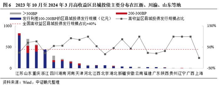 “35号文”后高收益区县城投债发行规模显著收缩。2023年10月以来,发行利差大于200BP的区县城投债发行规模及占比迅速下降,2023年四季度和2024年一季度发行规模分别仅737亿元和230亿元。鉴于近期城投债发行利差迅速收缩,我们将发行利差100BP以上定义为高收益区县城投债。2023年10月以来高收益区县城投债发行规模3,217亿元,发行规模较大,在城投债“资产荒”下,值得投资者关注。