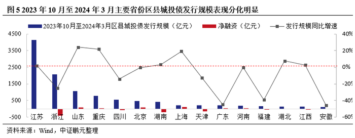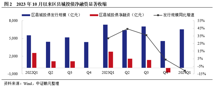 2023年四季度以来,城投债净融资大幅下滑,其中区县城投净融资历史性转负。除受政策严控城投新增发债融资外,贵州、天津、广西等获得较多特殊再融资债券资金支持的省份出现未到期债券提前兑付潮,且在区县城投债发行利差迅速下行环境下,发行人行使利率调整权大幅下调票面利率使得回售规模增加。另据我们的调研,部分区域的区县城投通过银行借款置换到期债券。2023年四季度及2024年一季度城投债发行规模同比增速显著回落,同期区县城投债发行规模同比增速下跌更多,且净融资转负为-731亿元。