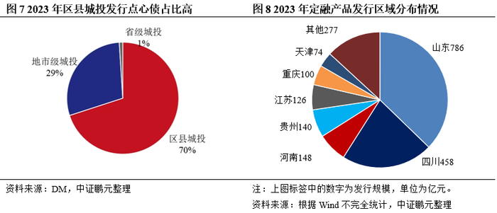 部分区县城投无奈继续通过非标、境外发债等渠道新增融资,一定程度缓解了短期流动性压力,但这可能会加大城投债务的管控难度。在监管严控债务增量,存量债务化债仍任重道远,城投持续面临较大资金压力背景下,部分区县通过融资租赁、定融、点心债等渠道新增融资。2023年度国内共124家城投平台发行点心债1,033亿元,同比增长超过2倍,其中区县城投发行主体占比70%。根据Wind的不完全统计,2023年度山东、四川、河南、贵州等地城投平台通过定融新增融资规模较大,且融资主体以区县城投为主。我们认为,非标、境外发债等融资渠道可在短期内缓解城投平台的流动性压力,但该等融资渠道成本较高,且点心债等境外债的发行监管政策将收紧,若城投平台对该等融资渠道依赖过高,可能会加大未来的债务管控的难度。
