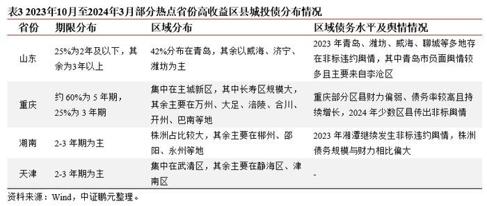 高收益区县城投债发行期限略长,对区县的投资仍需重点分析其上级政府财政实力、自身经济财政潜力,同时问题区域应将债券到期时非违约情形下的自由退出阻力作为重要考量因素之一