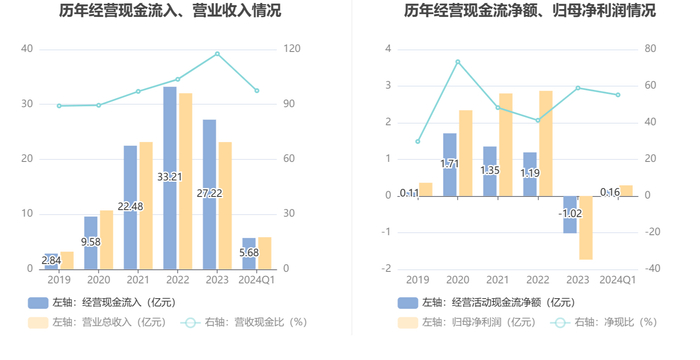 2024年第一季度,公司营业收入现金比为97.49%,净现比为55.22%。