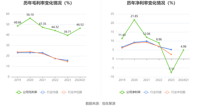 2024年第一季度,公司毛利率为46.52%,同比上升4.83个百分点;净利率为4.98%,较上年同期上升11.60个百分点。