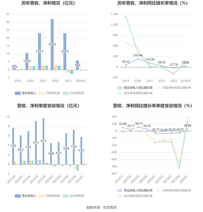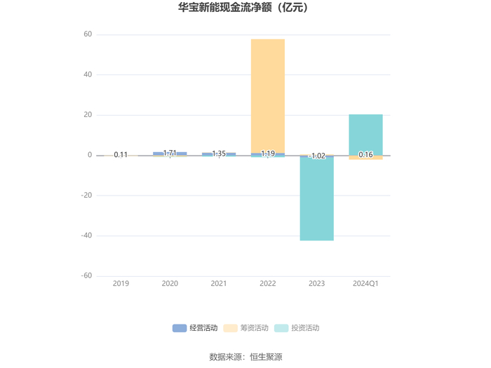 2024年第一季度,公司经营活动现金流净额为1601.29万元,同比增加1.84亿元,主要系报告期日常经营支出减少以及销售商品收到的现金流量上升所致;筹资活动现金流净额-2.08亿元,同比减少2.60亿元,主要系报告期归还到期的贷款以及库存股回购所致;投资活动现金流净额20.24亿元,上年同期为-16.13亿元,主要系报告期部分现金管理产品到期收回本金及利息所致。