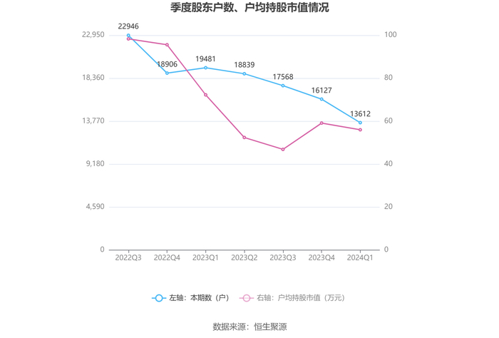筹码集中度方面,截至2024年一季度末,公司股东总户数为1.36万户,较上年末下降了2515户,降幅15.59%;户均持股市值由上年末的59.12万元下降至56.00万元,降幅为5.28%。