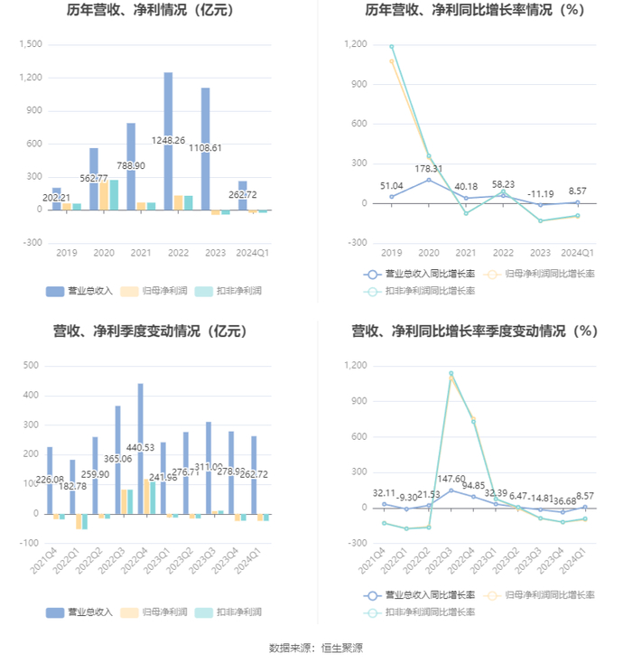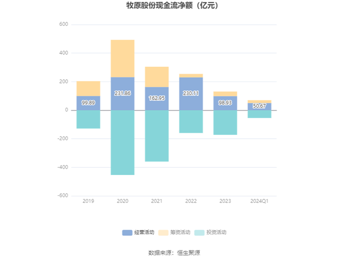 2024年第一季度,公司经营活动现金流净额为50.67亿元,同比增加89.21亿元;筹资活动现金流净额19.79亿元,同比减少81.95亿元;投资活动现金流净额-54.22亿元,上年同期为-40.47亿元。