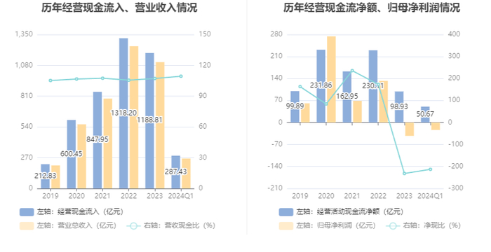 2024年第一季度,公司营业收入现金比为109.41%,净现比为-212.99%。